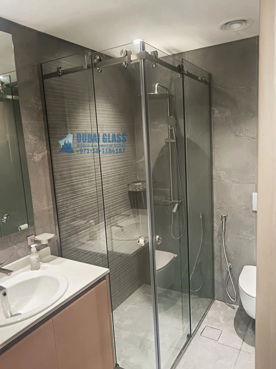 Corner sliding glass shower enclosure in Dubai with durable tempered glass for a sleek, modern bathroom. Call +971-58-1184187.